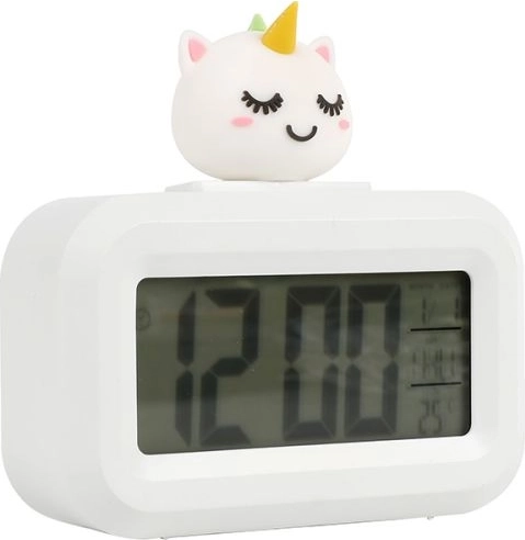 La graziosa sveglia bianca con motivo unicorno farà felici bambini e amanti degli accessori magici. Grazie alle dimensioni compatte è adatta al comodino o alla scrivania. Funziona con 2 batterie AAA (non incluse). Facile da usare, leggera e dal design sicuro, è ideale per bambini dai 3 anni in su.