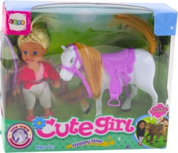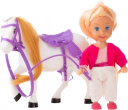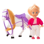Contenuto della confezione: mini bambola in tenuta da equitazione, cavallo bianco con criniera e coda lunghe, sella e briglie viola, frustino.