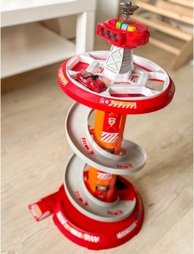 La rampa circolare garantisce una discesa fluida delle macchinine dal piano più alto fino alla base – ideale per gare e interventi d’azione.