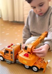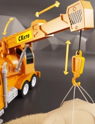La principale attrazione è il braccio mobile della gru con possibilità di regolazione dell'altezza e della lunghezza e rotazione del verricello per avvolgere e svolgere il cavo con gancio. Le proporzioni realistiche in scala 1:14 e la lavorazione dettagliata favoriscono lo sviluppo della motricità fine, della fantasia e del role-play durante la costruzione e il sollevamento dei carichi.