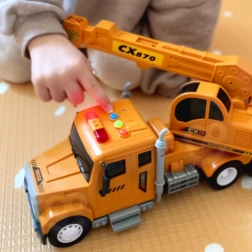 Il camion gru WOOPIE 1:14 è il giocattolo ideale per i piccoli costruttori. Quattro pulsanti colorati sul tetto della cabina attivano luci e vari suoni (avviamento del motore, clacson, rumori di marcia), mentre l'avanzamento assistito fa sì che il veicolo continui a muoversi da solo dopo una spinta.