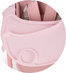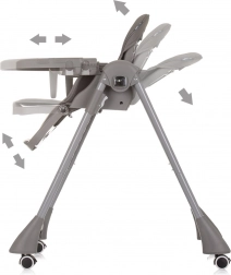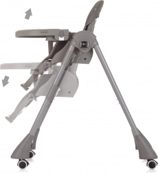 I genitori apprezzeranno il doppio vassoio: quello superiore rimovibile per una pulizia rapida e quello inferiore con barra a T per la massima sicurezza. Puoi adattare facilmente il seggiolone al tavolo da pranzo grazie ai 8 livelli di altezza. Le quattro ruote garantiscono mobilità in casa e dopo i pasti si richiude facilmente in formato compatto.