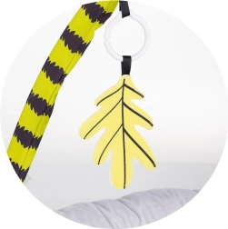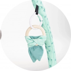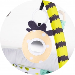 La zona interattiva con giochini in peluche, sonagli e specchietto invoglia il bimbo ad allungarsi, afferrare e seguire con lo sguardo, rafforzando così la coordinazione e la percezione visiva.