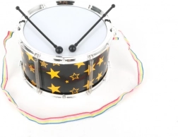 Il tamburo giallo con stelle nere e tracolla multicolore è visivamente attraente per i bambini.