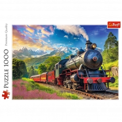 Puzzle Viaggio in Treno con 1000 pezzi che raffigurano una locomotiva a vapore che sfreccia tra le montagne. Una volta completato, l’immagine misura 683 x 480 mm.