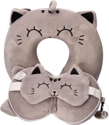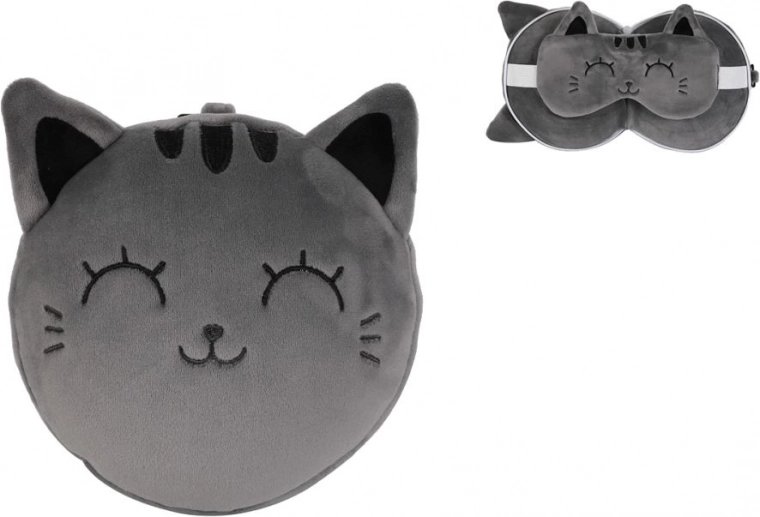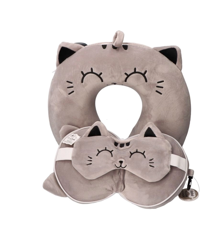 Comodo cuscino da viaggio con mascherina integrata a forma di gatto grigio garantisce comfort in viaggio per bambini e adulti. Le dimensioni compatte una volta aperto e il materiale morbido sostengono collo e testa durante il sonno in auto, aereo o treno. Adatto dai 3 anni e contrassegnato CE per un uso sicuro.