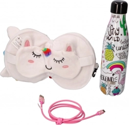 Comodo cuscino da viaggio con mascherina per gli occhi integrata in stile unicorno per un sonno tranquillo in movimento. Ideale per bambini dai 3 anni, materiale morbido, dimensioni compatte e certificazione CE per un uso sicuro.