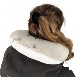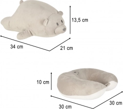 Questo pratico cuscino da viaggio 2 in 1 è ideale per bambini e adulti che cercano comfort durante il viaggio. Il cuscino si trasforma facilmente in un orsetto di peluche, ideale per coccolarsi. Offre un grande supporto per collo e testa grazie alla forma ergonomica e all'imbottitura leggera in sfere di polistirene.