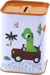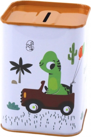 Le allegre illustrazioni del dinosauro in auto e i colori vivaci rendono il salvadanaio anche una bellissima decorazione.