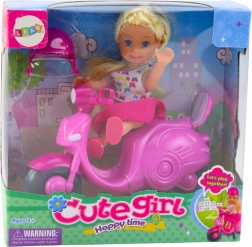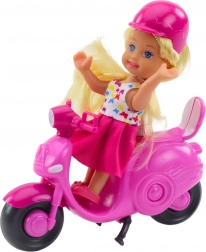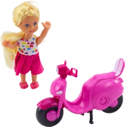 La bambola, alta 11 cm, ha lunghi capelli biondi e un grazioso vestitino. Lo scooter è in plastica resistente, dotato di ruote mobili e specchietti. Il set comprende anche un casco rosa che garantisce sicurezza durante la guida e aggiunge realismo.
