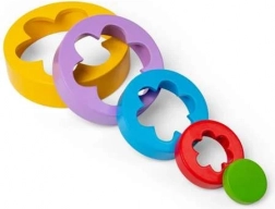 Cinque pezzi di diverse dimensioni permettono di costruire una torre o creare colorati motivi floreali. I bambini apprendono naturalmente i colori e la distinzione delle dimensioni.