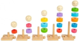 Impilare anelli e testine sulle aste sviluppa la presa, la precisione e la coordinazione mano–occhio – ideale dai 12 mesi.