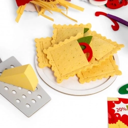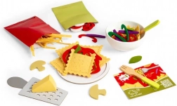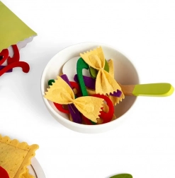Con questo set versatile i bambini possono giocare a fare i piccoli chef e preparare il proprio piatto di pasta. Gli ingredienti morbidi e colorati in feltro come tagliatelle, ravioli e farfalle sono completati da salsa di pomodoro, funghi, foglie di basilico e, inoltre, una ciotola e un piatto in legno, due forchette e una grattugia con una fetta di parmigiano: tutto per un divertimento in cucina realistico.