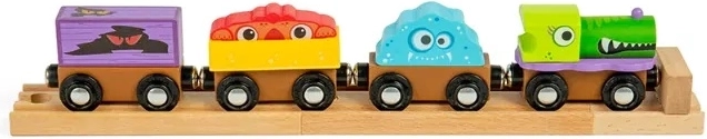 Divertente trenino di legno per piccoli amanti dei mostri: locomotiva e tre vagoni con carico rimovibile, due binari e finecorsa. Compatibile con la maggior parte delle ferrovie in legno. Realizzato in legno certificato FSC e rifinito con vernici atossiche per un gioco sicuro. Stimola creatività, abilità linguistiche e coordinazione occhio-mano.