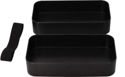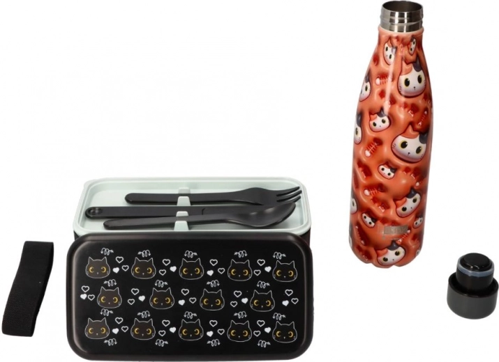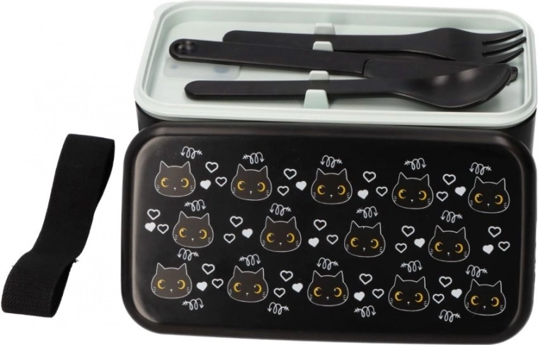 Elegante lunch box nero con motivo di gatto, ideale per lavoro, scuola e gite. I due livelli per porzioni separate mantengono il cibo ordinato e fresco, mentre il coperchio robusto e il nastro elastico garantiscono un trasporto sicuro senza aperture indesiderate.