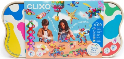 CLIXO Family Party è un grande set per tutta la famiglia e per il gioco di gruppo. Grazie al sistema magnetico brevettato con movimento rotativo a 360° e fissaggio in 24 posizioni, le tue creazioni rimangono salde e stabili. Con pezzi flessibili e multidirezionali costruisci facilmente modelli 2D e 3D – da animali e veicoli ad architetture e progetti scientifici.