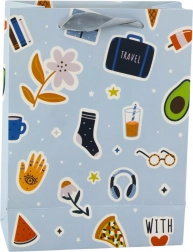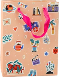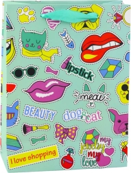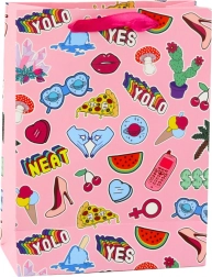 La borsa regalo con tema adesivi combina vari elementi grafici, come cuori, labbra, frutta e scritte, che le conferiscono un aspetto giovanile e originale. Realizzata in solido cartoncino decorativo garantisce il trasporto sicuro anche di regali più pesanti.