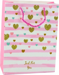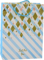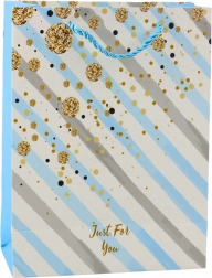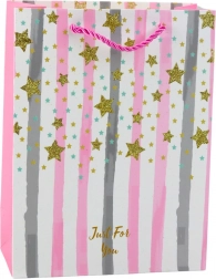 Le borse regalo sono dotate di comode impugnature a cordoncino in rosa e blu, che consentono un facile trasporto. Ogni borsa è decorata con motivi scintillanti, come stelle, cuori, rombi e punti dorati, che aggiungono raffinatezza e fascino.