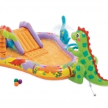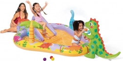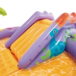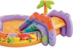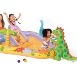 Adorabile parco acquatico per bambini di INTEX a tema dinosauri con scivolo, doccetta ad acqua collegabile al tubo da giardino e morbida zona di atterraggio per scivolate sicure. Include anche un dinosauro interattivo con canestro e palline per il lancio. Con capacità di 280 l, portata massima di 81 kg e rapido svuotamento, è ideale per il divertimento estivo dei bambini a partire da 3 anni.
