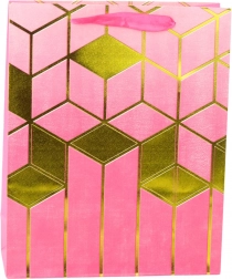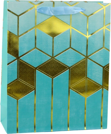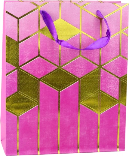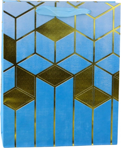 Questa elegante borsa regalo unisce design moderno e praticità. È decorata da vistosi motivi geometrici dorati e colori intensi, che la rendono una confezione rappresentativa per ogni dono. Il robusto cartoncino decorativo e i manici a cordoncino resistenti assicurano un trasporto comodo e sicuro.
