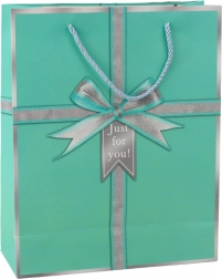 Elegante borsa regalo con motivo di fiocco argento e scritta "Just for you!" che dona a ogni dono un aspetto raffinato. Realizzata in cartoncino decorativo di alta qualità, ha manici a cordoncino robusti e una misura universale 32 × 26 × 12 cm per regali piccoli e medi. Disponibile in 4 colori eleganti – blu, verde, rosa e azzurro.