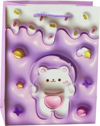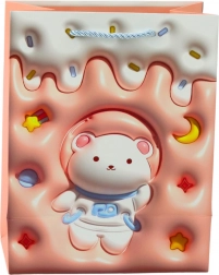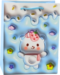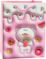 Questa borsa regalo in cartoncino decorativo conquista con una palette pastello nei toni del rosa, azzurro, arancione e viola. Il tenero orsetto con stelline e dettagli di frutta crea un effetto 3D che sembra farlo “uscire” dalla borsa. Il look raffinato è completato da manici a cordoncino coordinati nei colori, per un trasporto comodo e sicuro.