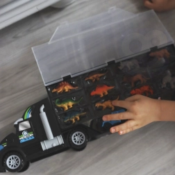 Scopri il camion multifunzionale che è anche una pratica valigetta e una divertente stazione di lancio. La cassa a doppia faccia con coperchio trasparente contiene in totale 24 figure o macchinine, così ognuna ha il suo posto e nulla si perde. Il set include 6 dinosauri, 6 animaletti, una piccola macchinina e un elicottero, tutto pronto per giocare subito.