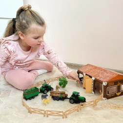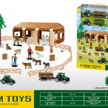 Il set completo comprende animaletti, tre personaggi, due trattori con rimorchi staccabili, fienile, recinzioni e molti accessori – tutto per costruire la propria fattoria.