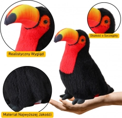 Tucano di peluche con altezza di 20 cm, riproduce fedelmente il caratteristico piumaggio nero con accenti rossi. Realizzato in materiale morbido e gradevole al tatto.