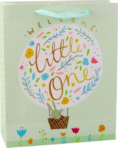 La borsa regalo Welcome Little One è realizzata in cartone decorativo di alta qualità, che garantisce durata e aspetto estetico. I manici in raso di colore menta aggiungono eleganza e comfort durante il trasporto. La borsa di dimensioni 32 x 26 x 12 cm è ideale per confezionare regali piccoli e medi come abbigliamento, giocattoli o cosmetici per il neonato.