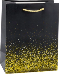 Disponibile in quattro varianti di colori: giallo, viola, rosso e turchese. Ogni colore è completato da uno sfondo nero che accentua l’eleganza e contrasta con l’effetto scintillante. I robusti manici in corda, coordinati con il gradiente, garantiscono comodità nel trasporto e la struttura solida assicura una conservazione sicura anche dei regali più pesanti.