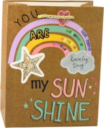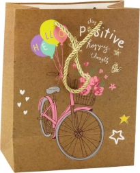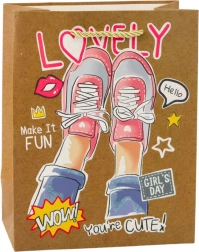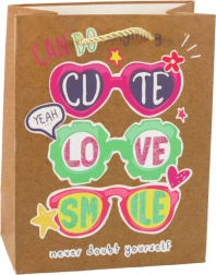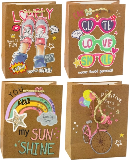 La borsa presenta quattro diversi motivi, ognuno affascinante con colori vivaci e slogan positivi che sottolineano il carattere giovanile ed ottimista. Manici intrecciati robusti garantiscono un trasporto comodo e sono coordinati cromaticamente con il design. La borsa di dimensioni 23 x 18 x 10,5 cm è ideale per confezionare regali di dimensioni medie e piccole come prodotti di bellezza, accessori, libri o dolci.