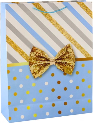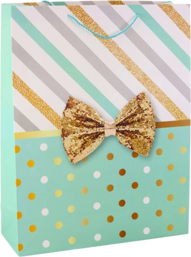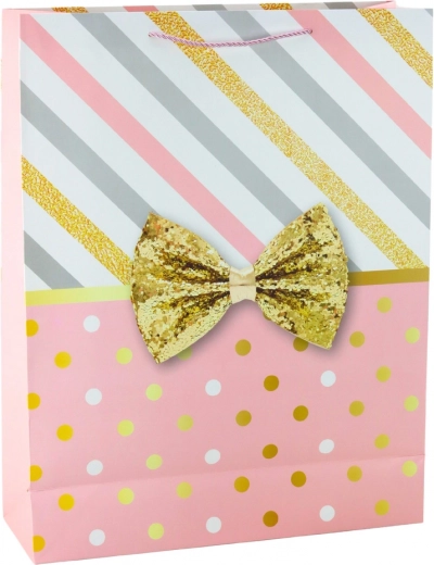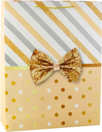Grande borsa regalo con un design unico di righe e pois in colore oro, completata da un fiocco decorativo.