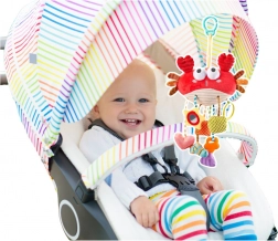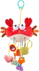 Il granchio contiene 9 funzioni in 1 prodotto, come un sonaglio, un mordicchiotto, un fischietto, le zampette scricchiolanti, uno specchietto con effetto specchio e altro ancora. Il giocattolo può essere facilmente fissato con clip universali al passeggino, culla, seggiolino auto o sdraietta.
