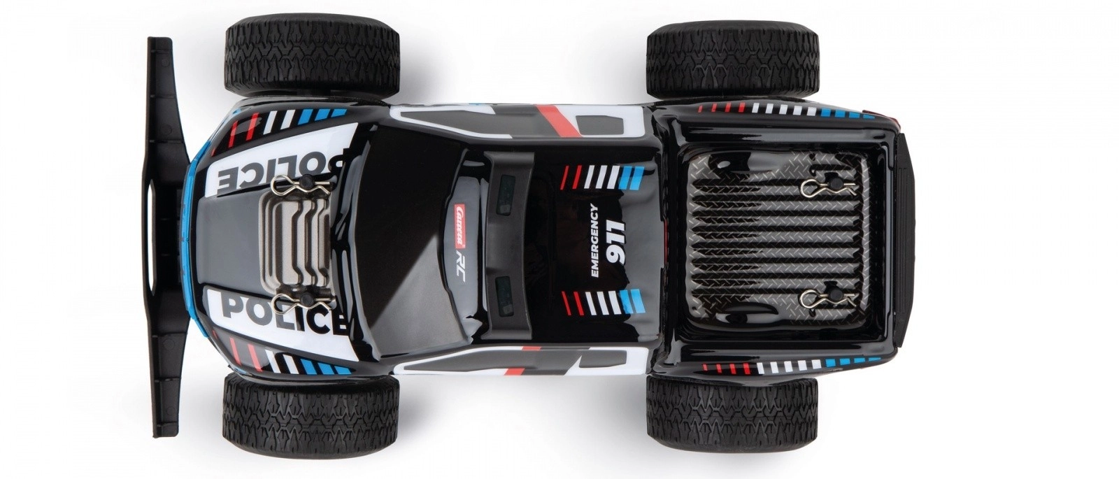Le sospensioni delle ruote ammortizzano efficacemente le asperità e garantiscono stabilità e comfort su moquette, marciapiedi e terreno leggero. Le grandi ruote scolpite e i paraurti robusti gestiscono una guida dinamica e rapidi cambi di direzione, rendendo il modello ideale per gare e inseguimenti di polizia in casa e all’aperto.