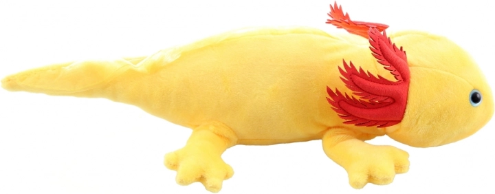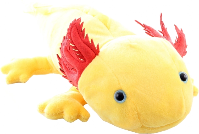 Corpicino giallo con branchie esterne rosse e cuciture curate fanno dell’axolotl una decorazione incantevole e un giocattolo irresistibile.