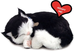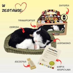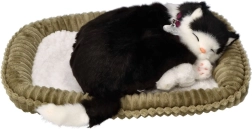 Questa gattina di peluche realistica in versione bianco-nera dorme serenamente sulla sua cuccia e “respira” dolcemente, creando un’atmosfera accogliente e la sensazione della presenza di un vero animale domestico. Grazie ai dettagli accurati, al collarino con targhetta e al pelo morbido, è un regalo perfetto per bambini dai 3 anni in su e per gli amanti dei gatti.