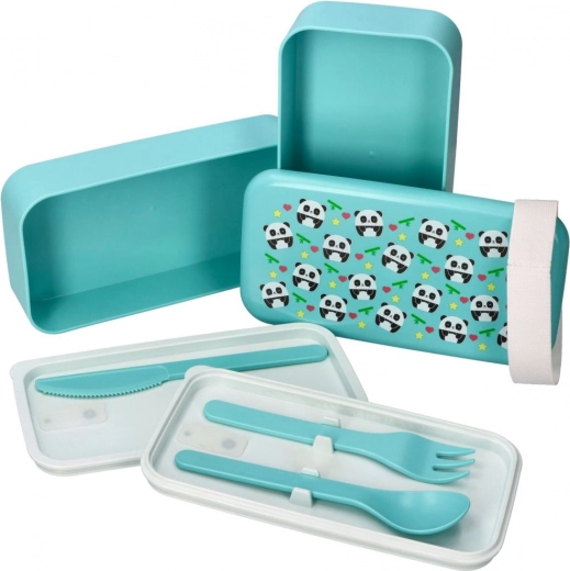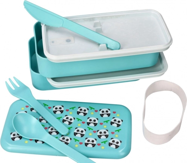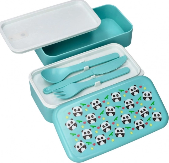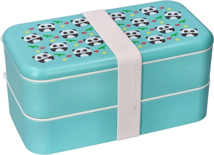 Elegante bento box a due livelli di colore turchese con un simpatico motivo panda, mantiene il cibo fresco e separato. Grazie alle dimensioni compatte 20 × 10,6 × 10 cm entra nello zaino scolastico o nella borsa da lavoro, e la fascia elastica tiene tutto ben fermo.