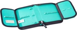 Una volta aperto, l'astuccio si apre completamente, facilitando l'organizzazione e la ricerca degli strumenti necessari. Gli elastici robusti sono adatti per conservare matite e pennarelli triangolari. L'astuccio è rispettoso dell'ambiente poiché è realizzato con materiali riciclati.
