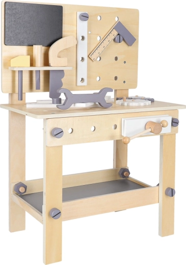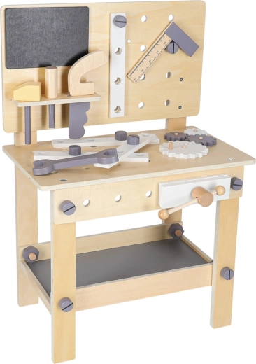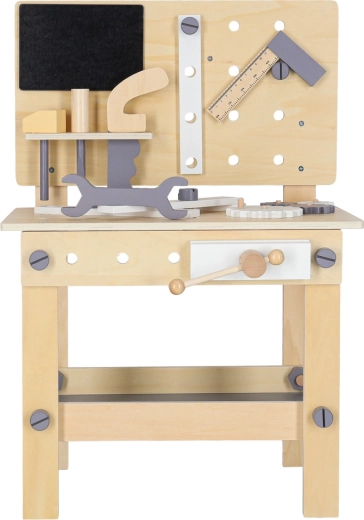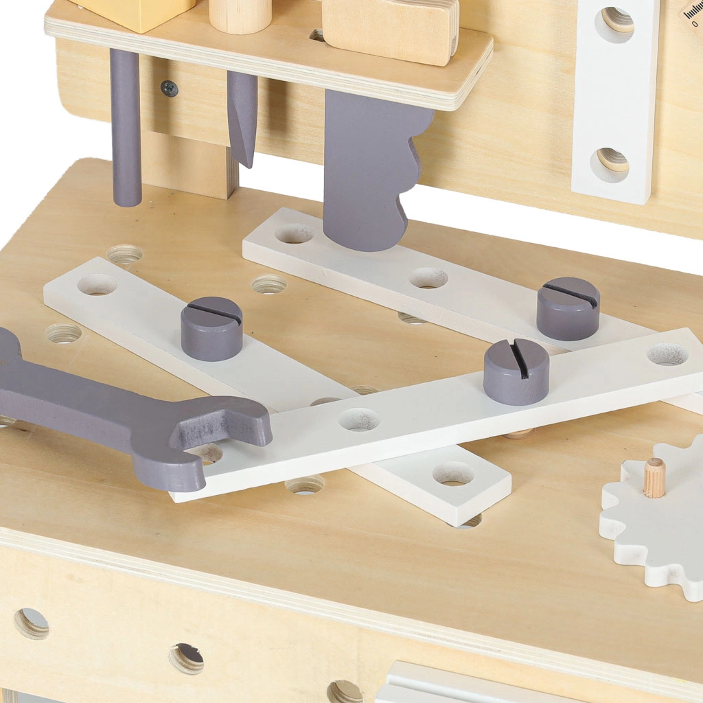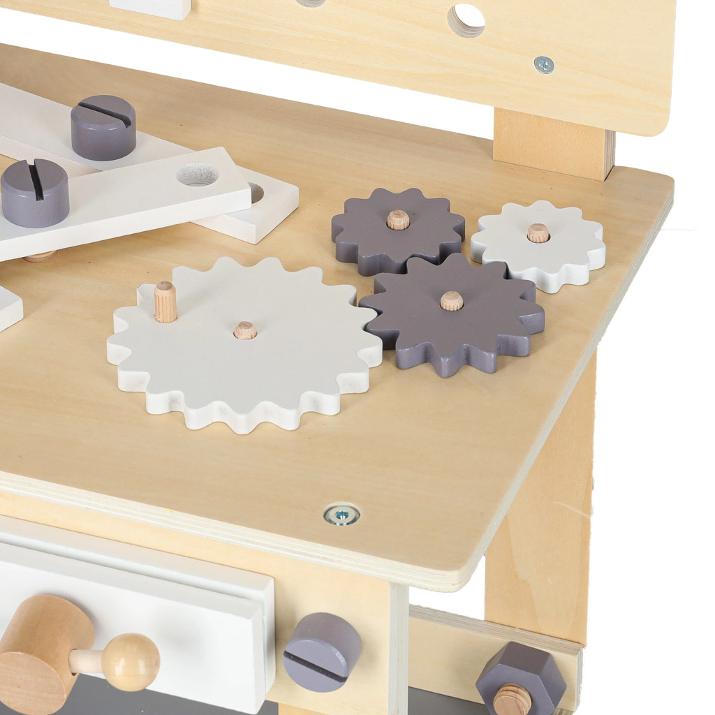 Il banco da lavoro in legno è ideale per i bambini che amano riparare e costruire. Grazie al ricco set di strumenti e accessori, possono provare avvitare, martellare, misurare e far girare gli ingranaggi. Il design stabile in colori neutri si integra perfettamente nella cameretta.