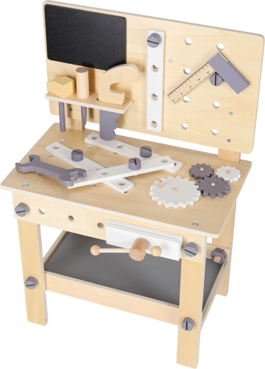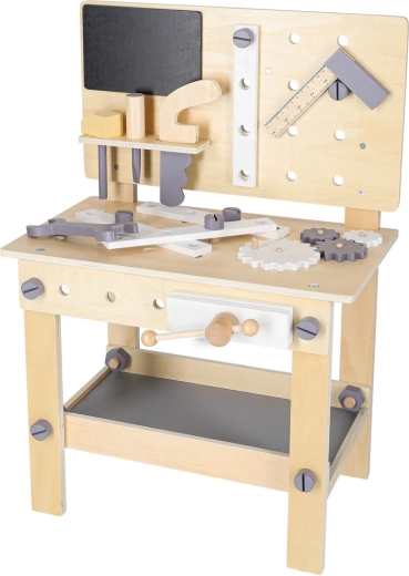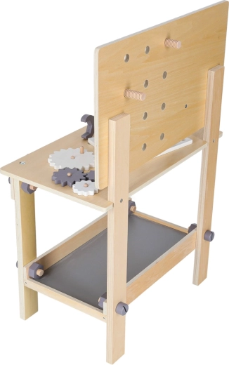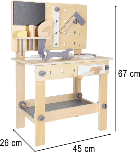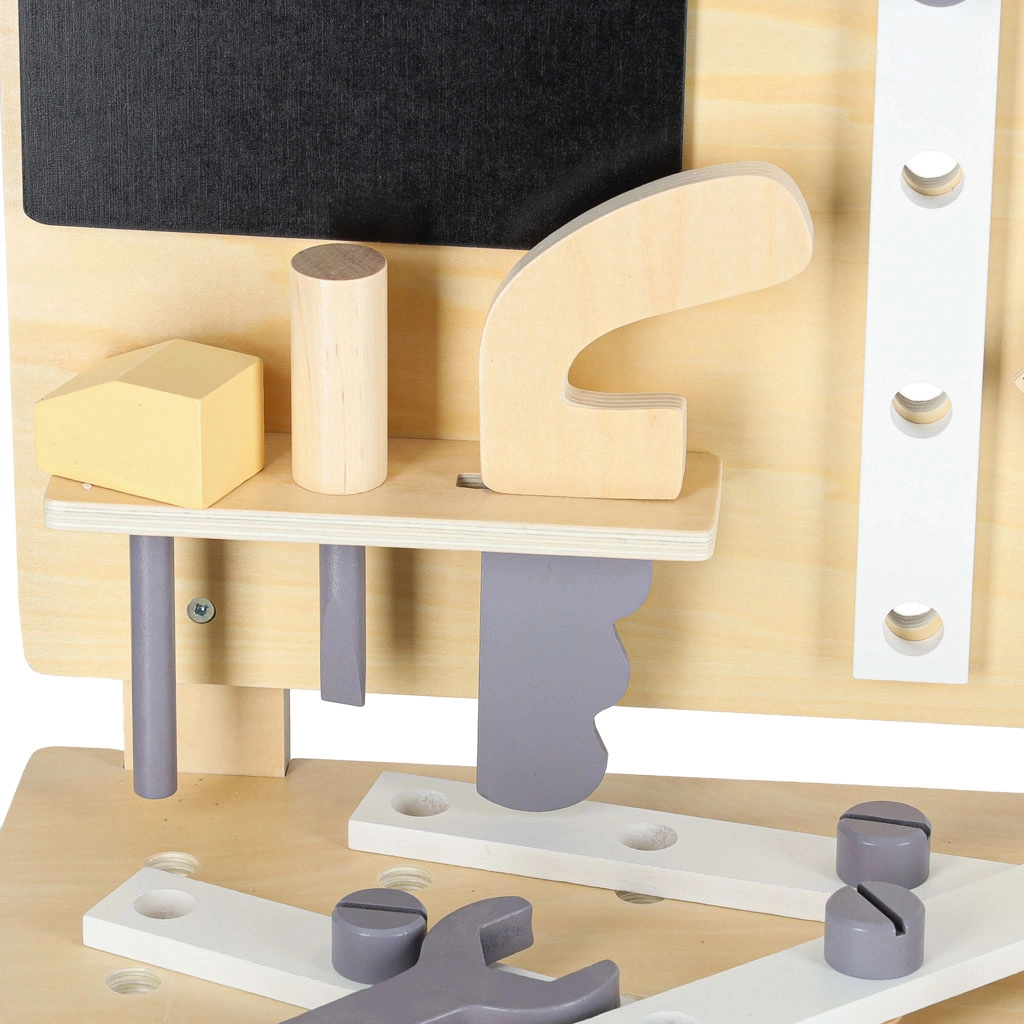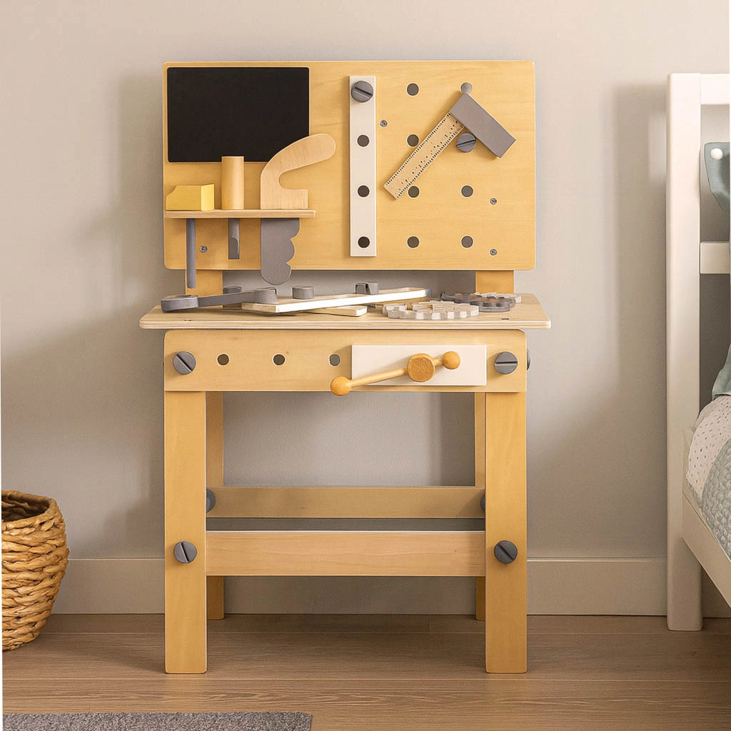 Elegante banco da lavoro in legno per piccoli tuttofare che offre ore di gioco creativo e apprendimento. Include martelletto, cacciavite, chiave, sega, righello, viti, dadi, ruote dentate e una morsa funzionante. La struttura robusta, con mensola portaoggetti e pannello forato, favorisce l’ordine e lo sviluppo della motricità fine e del pensiero logico.