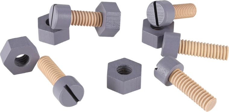 Sega, martello, cacciavite, chiave inglese, righello, viti e dadi: tutto il necessario per il montaggio creativo e lo sviluppo della motricità fine.