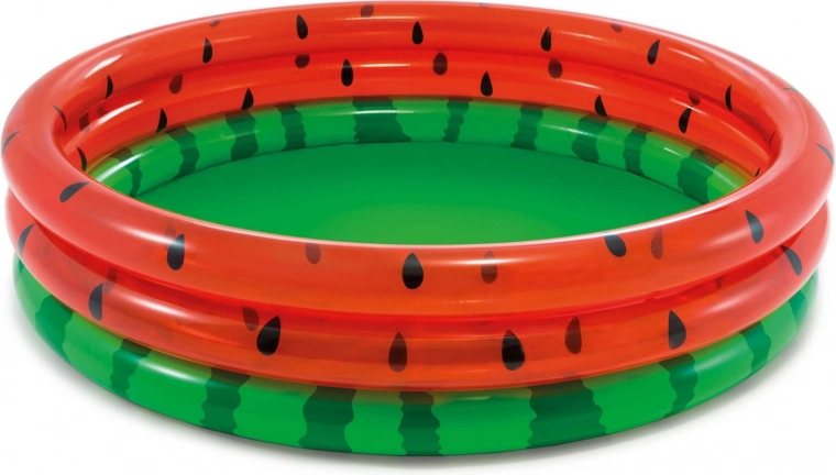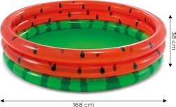 Divertimento estivo in giardino per i più piccoli! Piscina gonfiabile rotonda con motivo anguria del marchio INTEX, che offre ampio spazio per giocare (168 × 38 cm), pareti in PVC resistente con 3 anelli e capacità di 581 l. Ideale per bambini da 2 anni, con installazione facile e design accattivante per infinite avventure acquatiche.