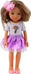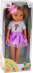 La bambola Pretty Girl indossa una maglietta bianca con stampa colorata di palloncini, che si abbina perfettamente alla gonna di tulle viola con un leggero luccichio. A completare l'outfit ci sono scarpette rosa, che danno un aspetto alla moda e gioioso. L'abito rimovibile permette di cambiare look alla bambola e di inventare nuovi outfit. Grazie agli arti mobili e alla testa, la bambola è facile da maneggiare e può essere seduta, muoversi o inscenare diverse scene.