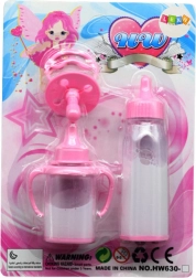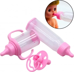 Include due biberon diversi e un succhietto in un delicato colore rosa. Perfetto per giochi di ruolo e simulazione della cura della bambola.