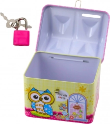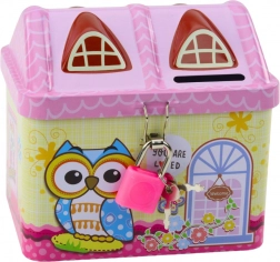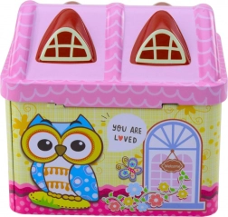 Salvadanaio a forma di casetta con motivo gufo in colori pastello conquisterà ogni bambino.