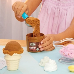 Grazie alla sabbia modellabile e al pratico dosatore, i bambini creano facilmente palline realistiche per coni e coppette: divertimento e allenamento della motricità fine.