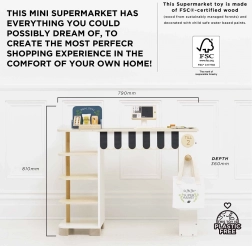 La bancarella è realizzata in legno FSC di alta qualità e materiali naturali, rifinita a mano con vernici ecologiche. Questo giocattolo sostenibile è 100% senza plastica e progettato per durare a lungo. Il design tradizionale con dettagli moderni cattura l’attenzione dei bambini a prima vista.