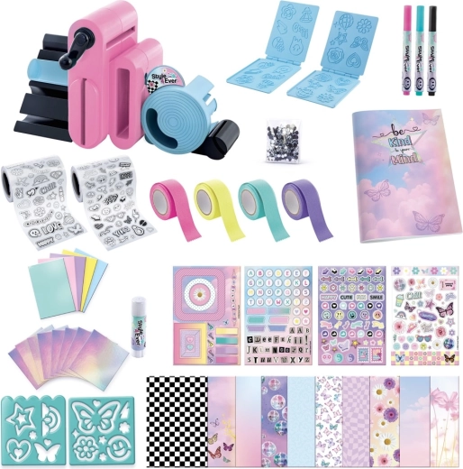 Nel set trovi più di 150 accessori: fogli di carta, adesivi in bianco e nero e a colori, pennarelli, colle glitterate, nastri decorativi e stencil a tema con motivi floreali, farfalle, stelle e scritte come “Be Happy” o “Cool”. Nella confezione troverai anche un piccolo taccuino per utilizzare subito le nuove decorazioni.