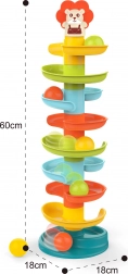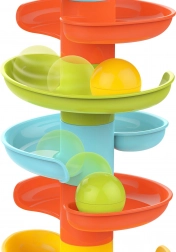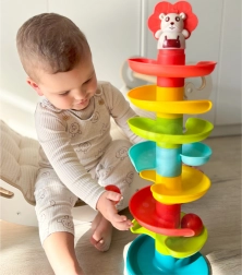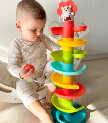 Costruisci la vivace torre a spirale e osserva le palline rotolare giù livello dopo livello. I pezzi del percorso si agganciano facilmente, così i bambini possono costruire più volte, allenando pazienza e creatività. Ognuna delle 6 palline colorate produce un piacevole tintinnio in movimento, stimolando i sensi e prolungando il gioco.